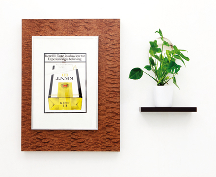 Untitled (...after David Catherall), 2011 Framed silkscreen print titled "Kent III" by David Catherall from 2007, veneered panels, shelf, mirror with monstera deliciosa.