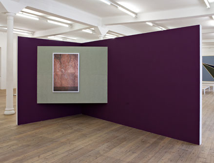 Untitled (...New Fictions), 2012 A framed photograph from Tony Law on green particleboard on purple walls. Installation view from 'Afterimage' Kunsthalle Exnergasse WUK, Vienna, 2012