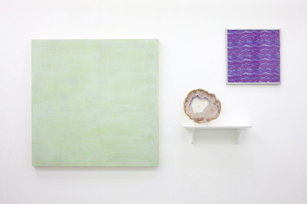 Acrylic on board with agate crystal and framed textile